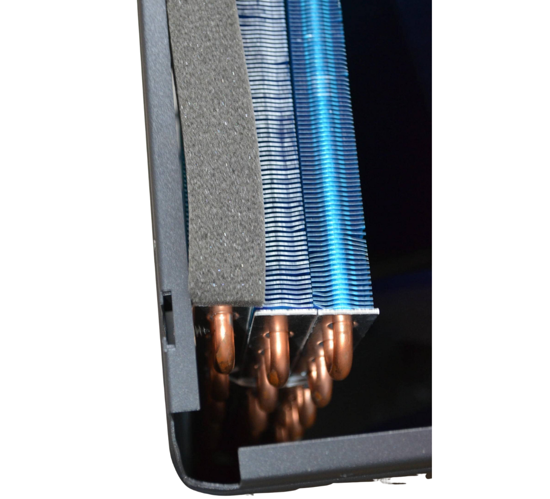 Горячий воздух после передачи тепла воздуху наружу выбрасывается через передние решетки вентиляторов.